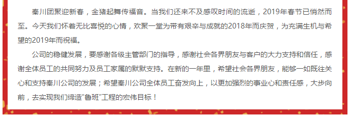 熱烈祝賀陜西秦川公司《2019年創(chuàng)新發(fā)展年會(huì)》圓滿落幕,恭祝大家:新年快樂(lè),身體健康,闔家幸福!