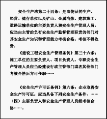 采用書面或計(jì)算機(jī)閉卷考試方式,內(nèi)容包括安全生產(chǎn)法律法規(guī)、安全管理和安全技術(shù)等內(nèi)容。其中,法律法規(guī)占20%,安全管理占40%,土建綜合安全技術(shù)占40%。